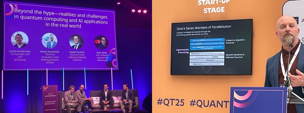 El primer día del evento, ya con nuestro director Pablo Coca, seguimos las sesiones estratégicas y mesas sectoriales en ámbitos como logística, transporte y energía, además de conocer las propuestas más innovadoras de start-ups. Entre ellas encontramos soluciones para acelerar el desarrollo de casos de uso, como la plataforma Luna Quantum, o mecanismos para mejorar el rendimiento mediante paralelización, como los de Qoro. También intercambiamos experiencias con investigadores de la Universidad de Wageningen, que compartieron sus proyectos piloto en el sector ganadero, aplicando técnicas cuánticas en genética animal y selección de ganado.